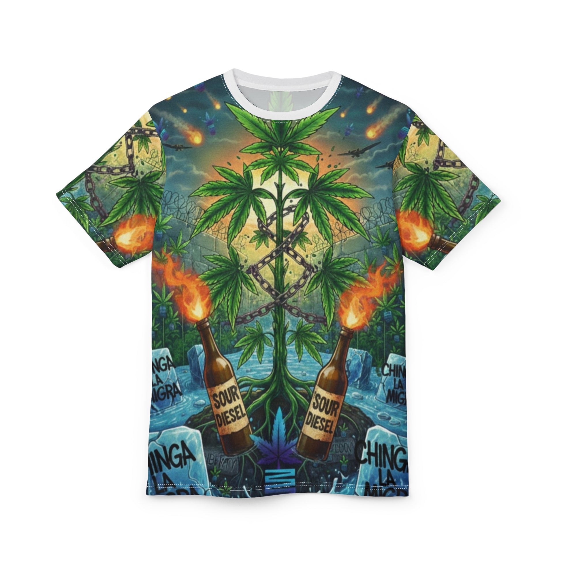 This all-over printed tee brings a bold, rebellious vibe to everyday wear. Vivid, mirrored artwork wraps the entire shirt: towering cannabis leaves rise from a turbulent seascape, flanked by lit Molotov-style bottles labeled “Sour Diesel.” Saturated greens and oceanic blues meet warm torch flames and sunset tones to create a streetwise, psychedelic scene that reads like a poster come to life. The lightweight polyester keeps colors punchy and the cut-and-sew construction ensures the design flows seamlessly across seams—so the image remains immersive whether you’re walking the boardwalk or hanging with friends. Wear it when you want your look to start conversations, anchor a counterculture outfit, or add a cinematic layer to a laid-back night out.