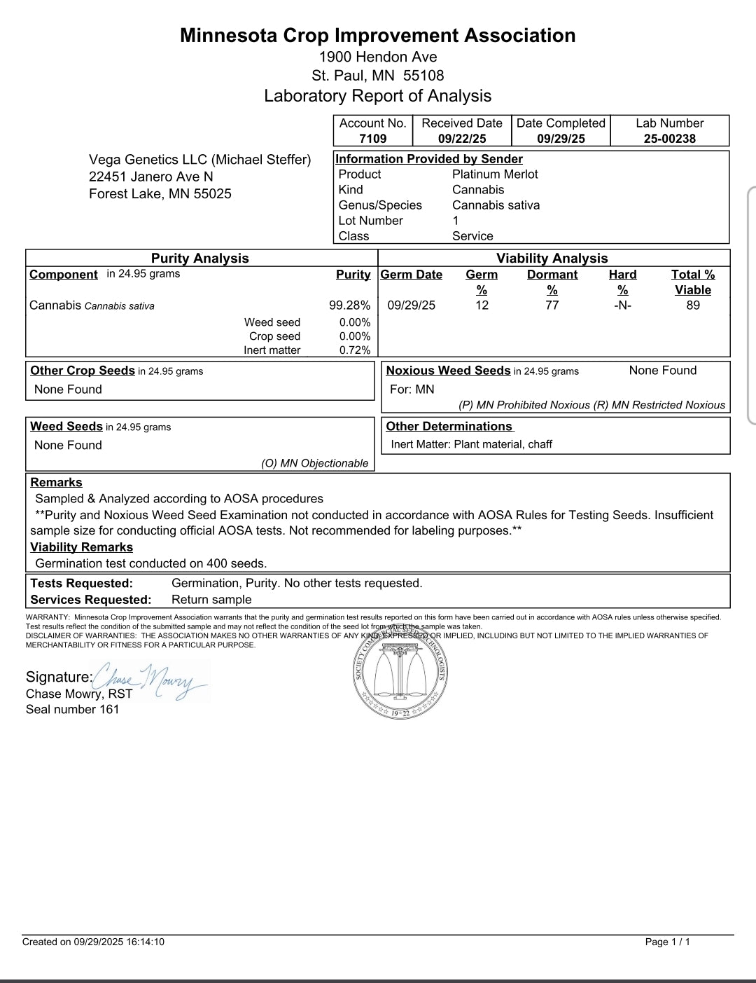 Platinum Merlot is an isolated phenotype of the Aurora Merlot from Vega Genetics, which was created by blending two absolute legends in the industry: Northern Lights × Greasy Grapes. We then selected from dozens of phenotypes and self-crossed this one for its uniquely distinct traits! This strain is a monster yielder, boasting huge, frosty platinum buds on every branch!